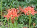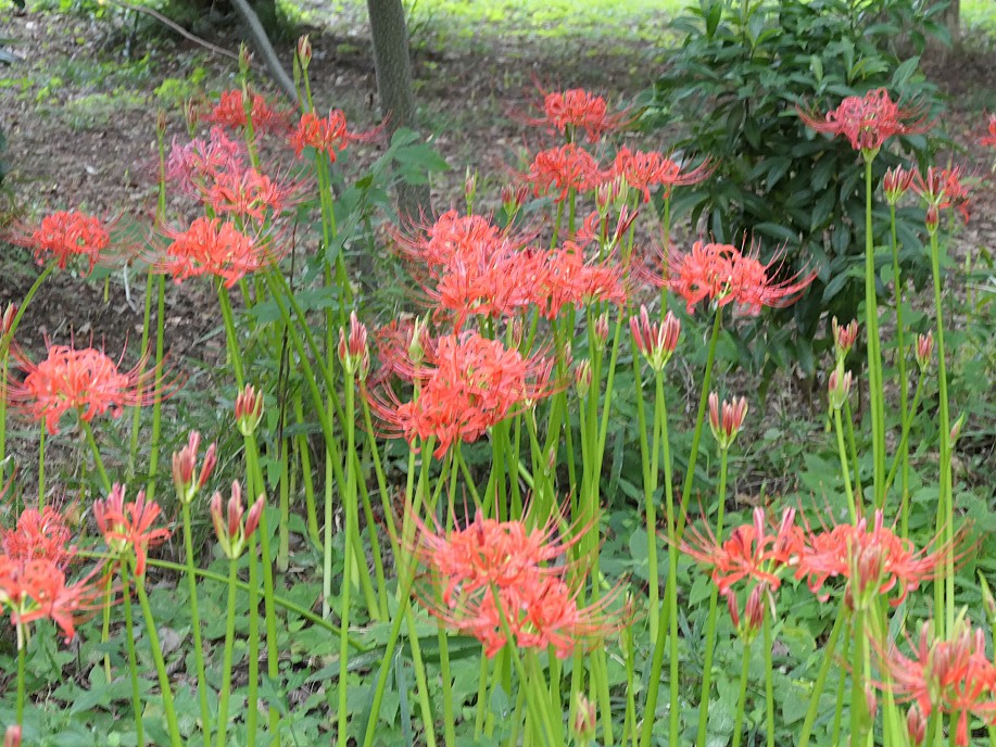 ヒガンバナ(彼岸花;ヒガンバナ科ヒガンバナ属)の咲き始め、多くの株はまだ茎がツンツンの状態 |