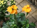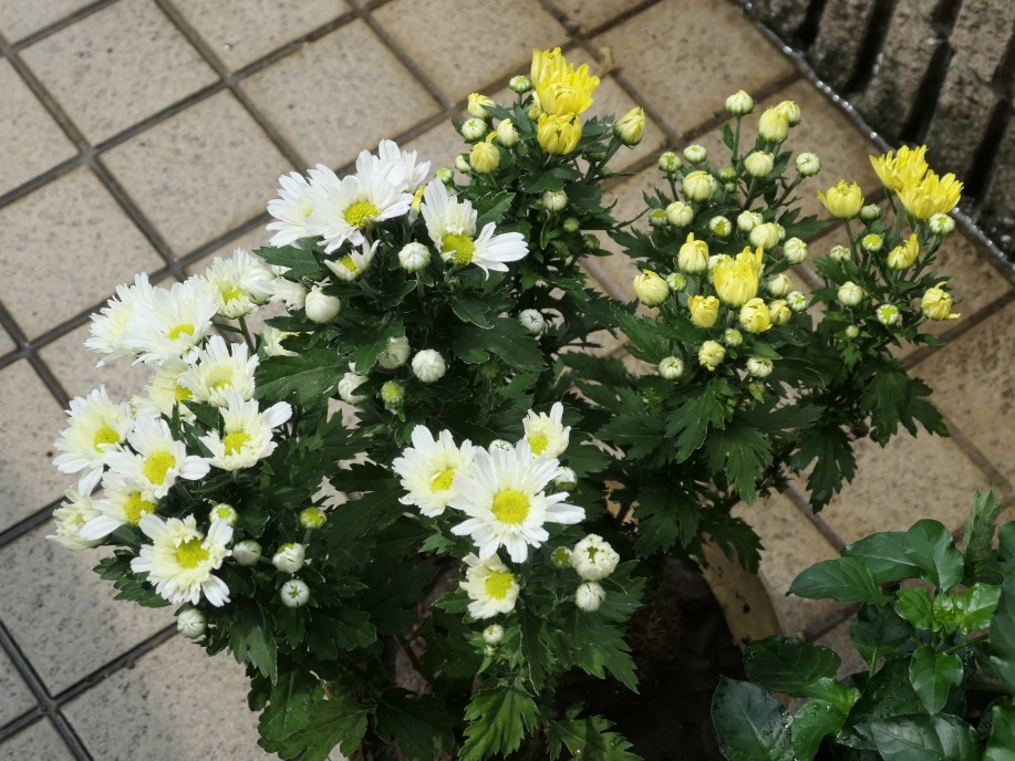 わが家の庭先、左はクロッサンドラ(キツネノマゴ科クロッサンドラ属)、右はガーデンマム(キク科キク属) |