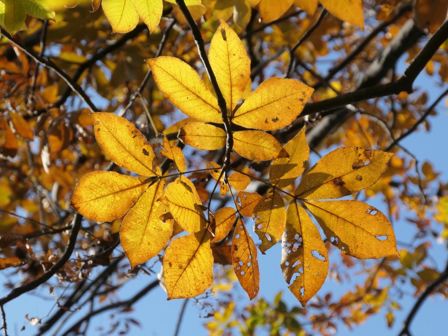 | 北米に広く分布する落葉広葉樹のヒッコリー(クルミ科ペカン属)。英名はhickory。雌雄異花で小さな雌花は枝先に数個つき、雄花は枝先の葉腋から穂状に垂れ下がる。葉は5枚の小葉からなる羽状複葉。秋には木の実(核果)がつき、硬い殻の中の小さい実は食することができる。晩秋に見事に黄葉します。 |